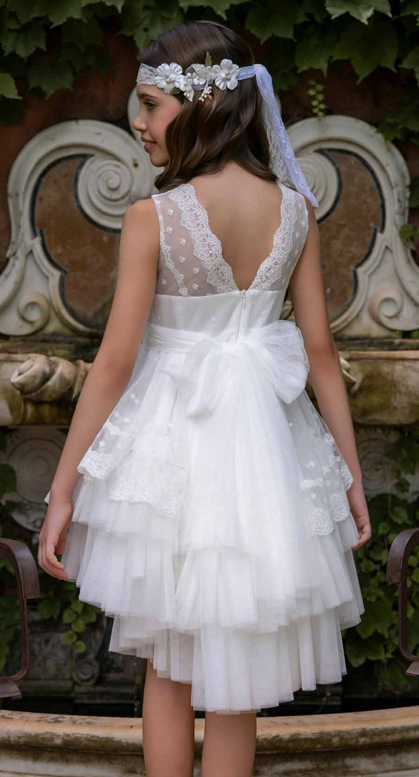 ABITO SMANICATO CERIMONIA CON CODA TULLE E PIZZO