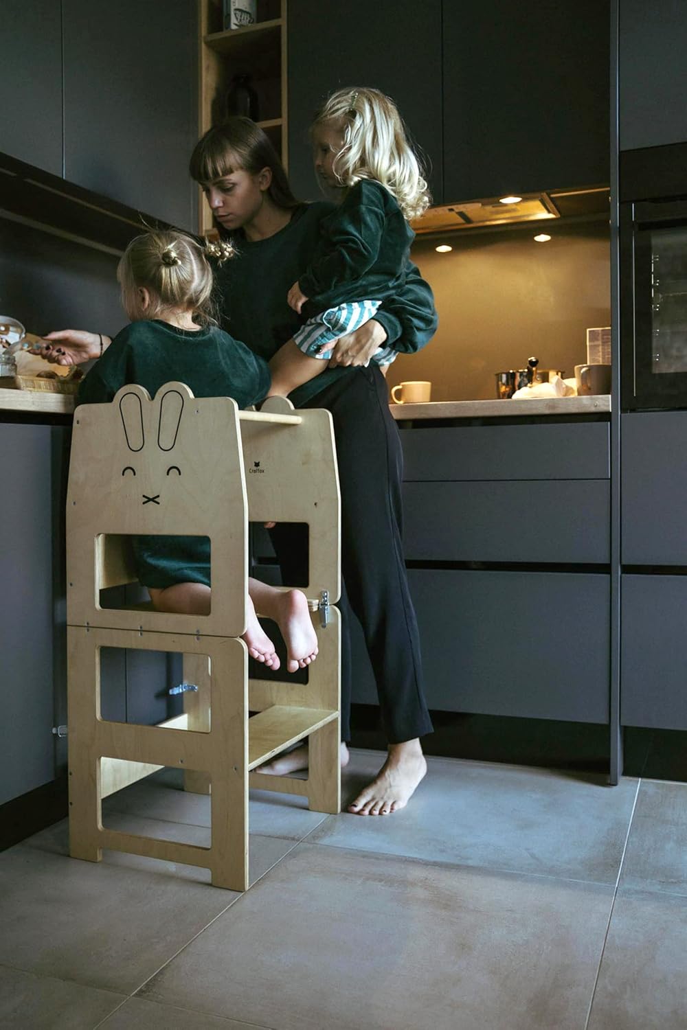 La torre da cucina Craffox è un dispositivo sicuro per salire e sorvegliare il piano di lavoro e alleggerirà notevolmente la cura dei giovani genitori e darà molto più tempo libero in cucina.